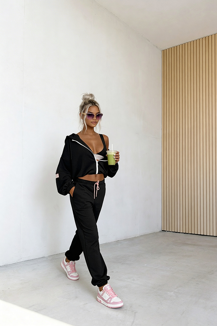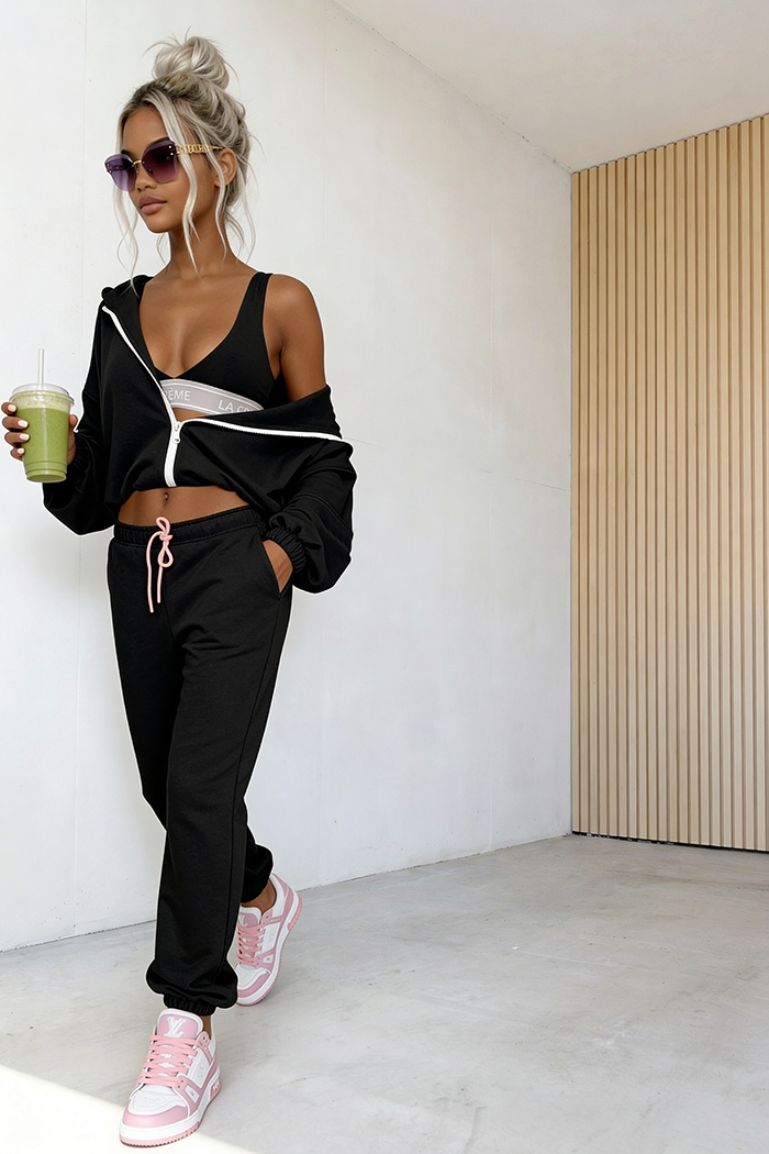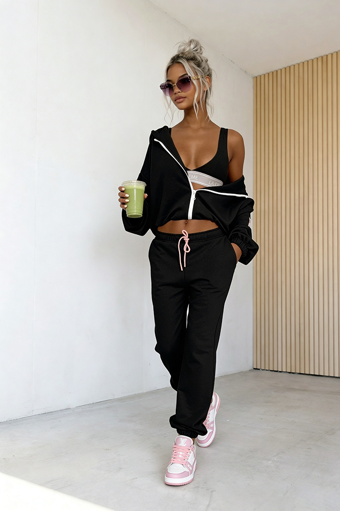 3-częściowy komplet, który łączy wygodę z nowoczesnym stylem. W jego skład wchodzi bluza z zamkiem i kapturem, spodnie z elastyczną talią oraz dopasowany top, tworząc spójną i funkcjonalną całość. Idealny wybór na co dzień – zapewnia komfort noszenia, swobodę ruchów i modny wygląd bez wysiłku.