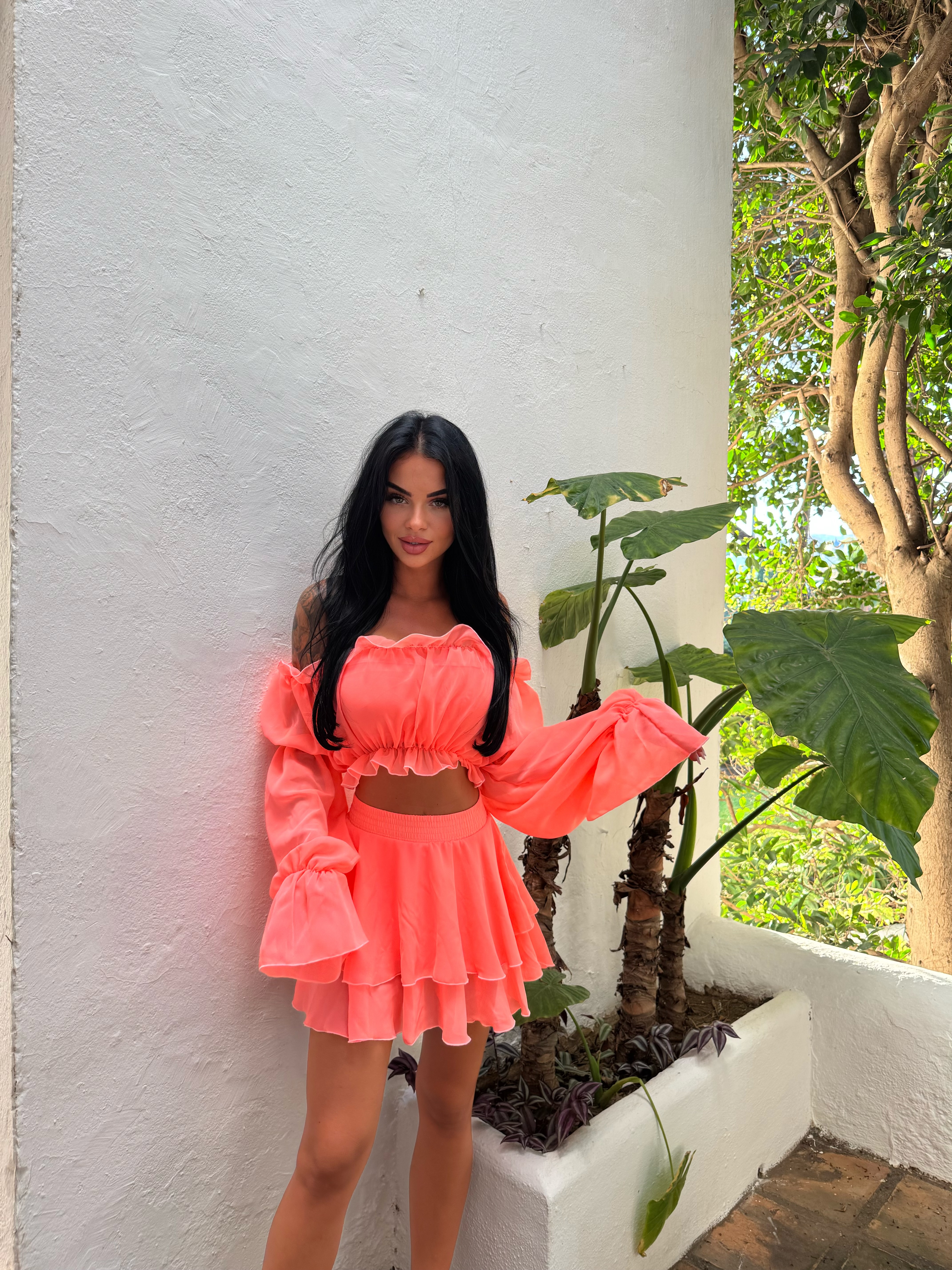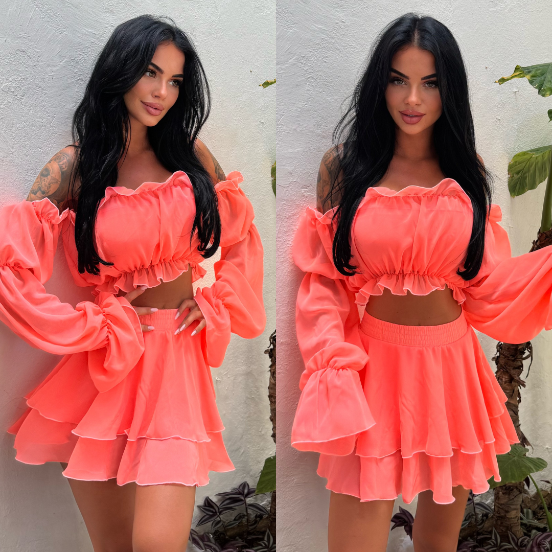 Ten komplet to totalna petarda! Kolor przyciąga spojrzenia, a krój pięknie podkreśla talię. Materiał jest lekki i przyjemny, idealny na upały