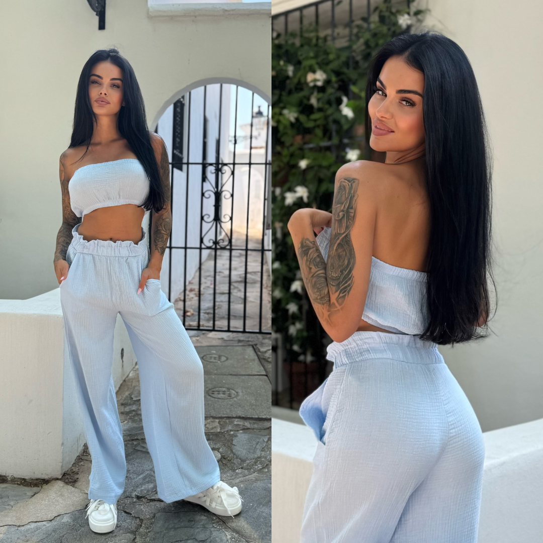 Muślinowy komplet – top bandeau + szerokie spodnie