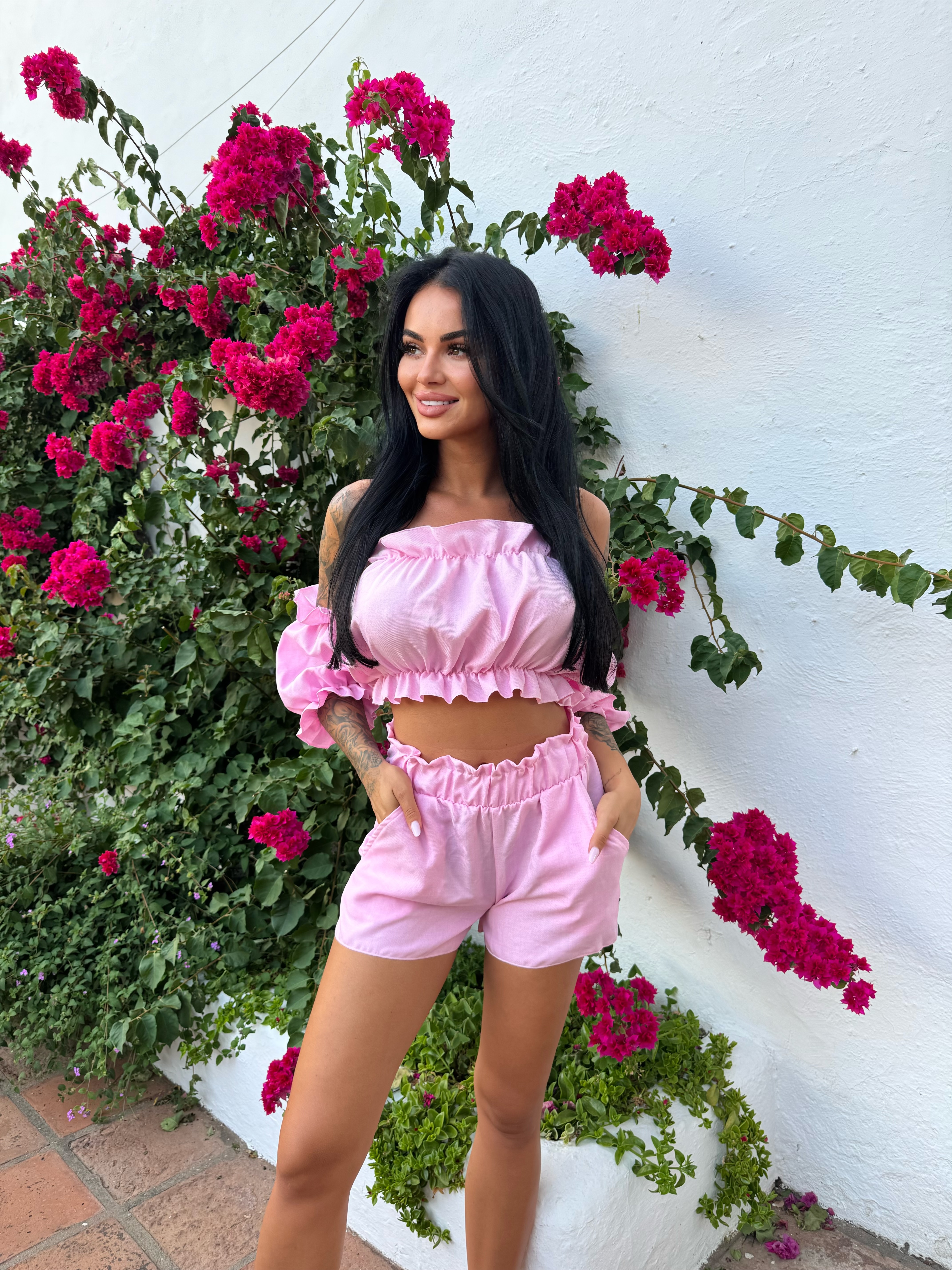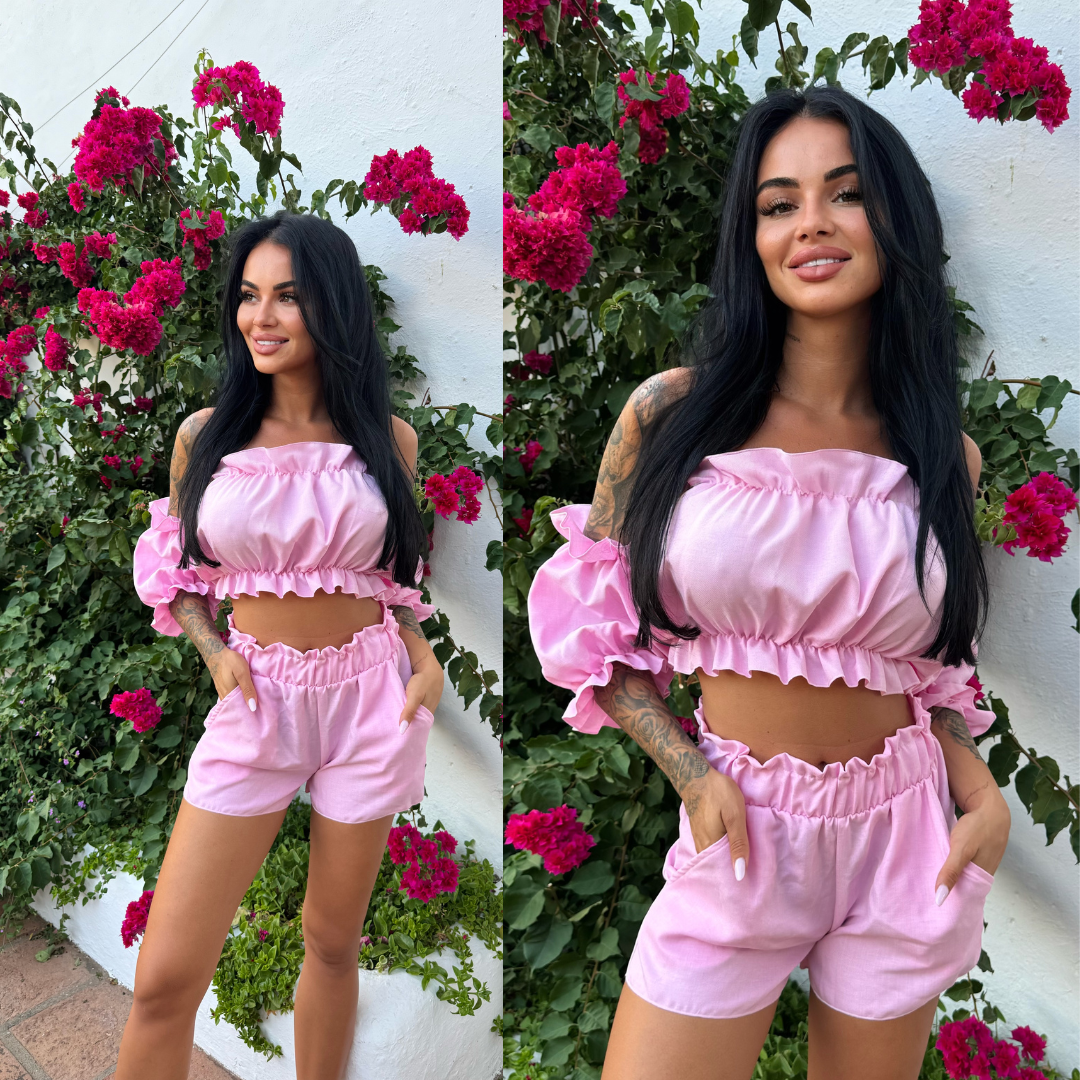Lekki i wygodny komplet o strukturze lnu jest idealny na lato. Krótki top typu hiszpanka pięknie podkreśla ramiona i szyję. Szorty z miękką, nie uciskającą gumką w pasie zapewniają komfort noszenia. Całość wykonana z przewiewnego materiału, który świetnie sprawdza się w ciepłe dni.