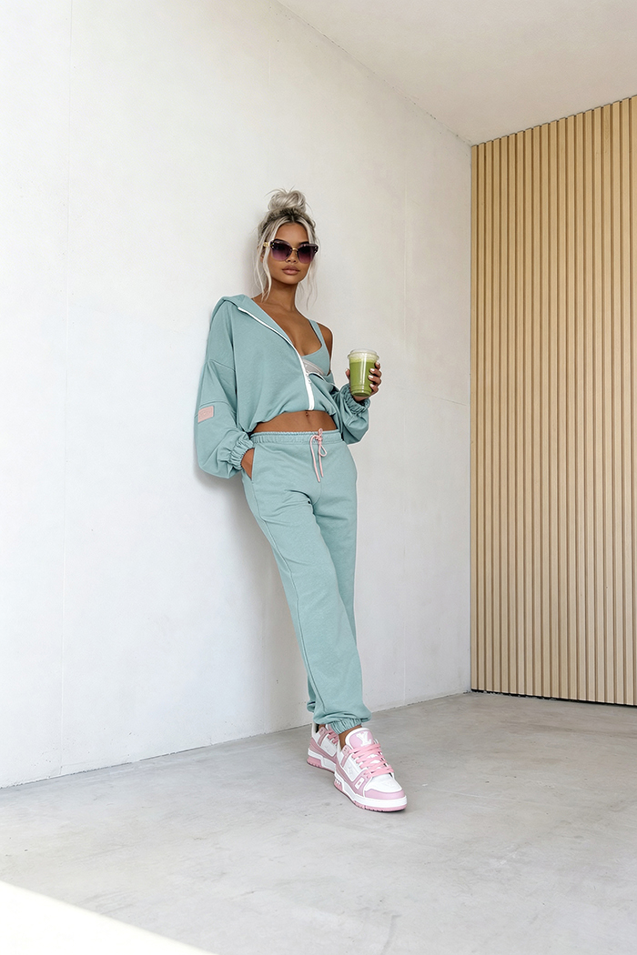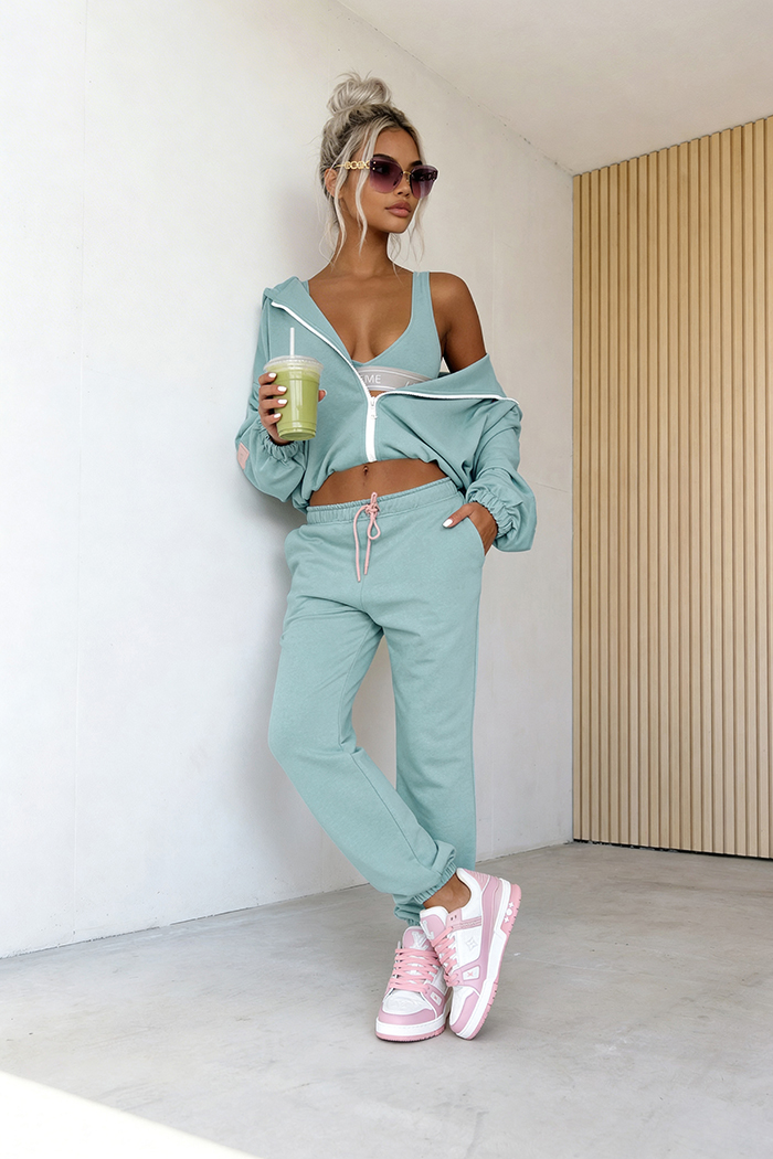 3-częściowy komplet, który łączy wygodę z nowoczesnym stylem. W jego skład wchodzi bluza z zamkiem i kapturem, spodnie z elastyczną talią oraz dopasowany top, tworząc spójną i funkcjonalną całość. Idealny wybór na co dzień – zapewnia komfort noszenia, swobodę ruchów i modny wygląd bez wysiłku.