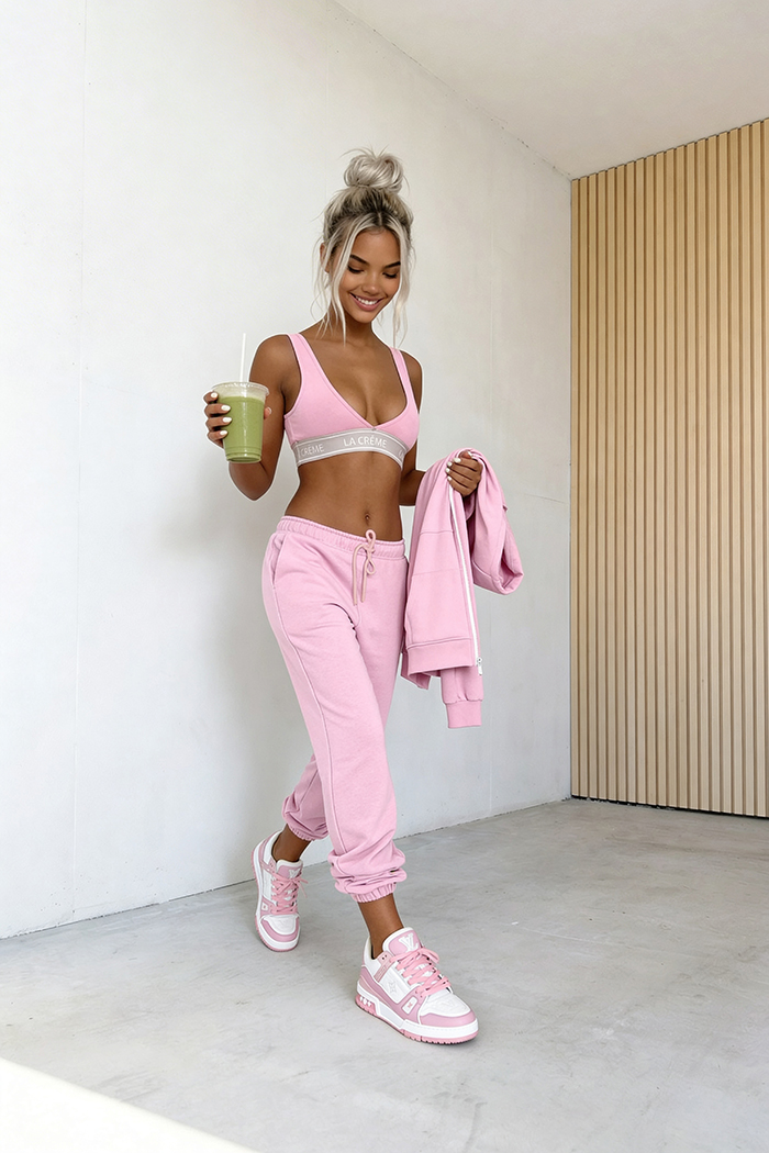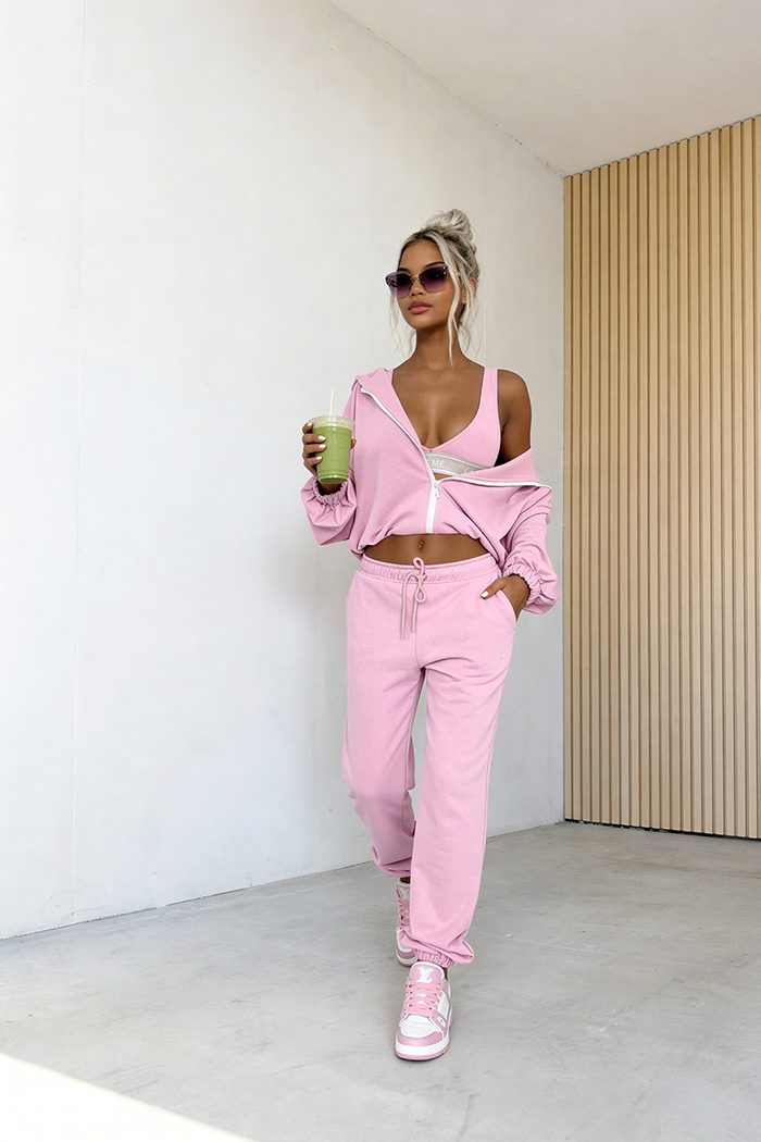 3-częściowy komplet, który łączy wygodę z nowoczesnym stylem. W jego skład wchodzi bluza z zamkiem i kapturem, spodnie z elastyczną talią oraz dopasowany top, tworząc spójną i funkcjonalną całość. Idealny wybór na co dzień – zapewnia komfort noszenia, swobodę ruchów i modny wygląd bez wysiłku.