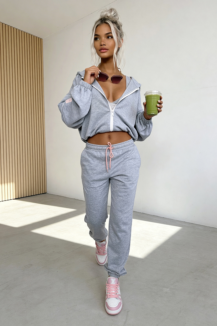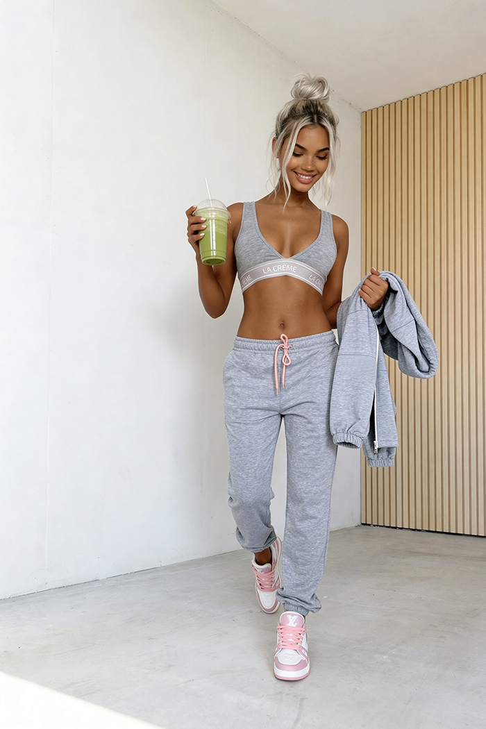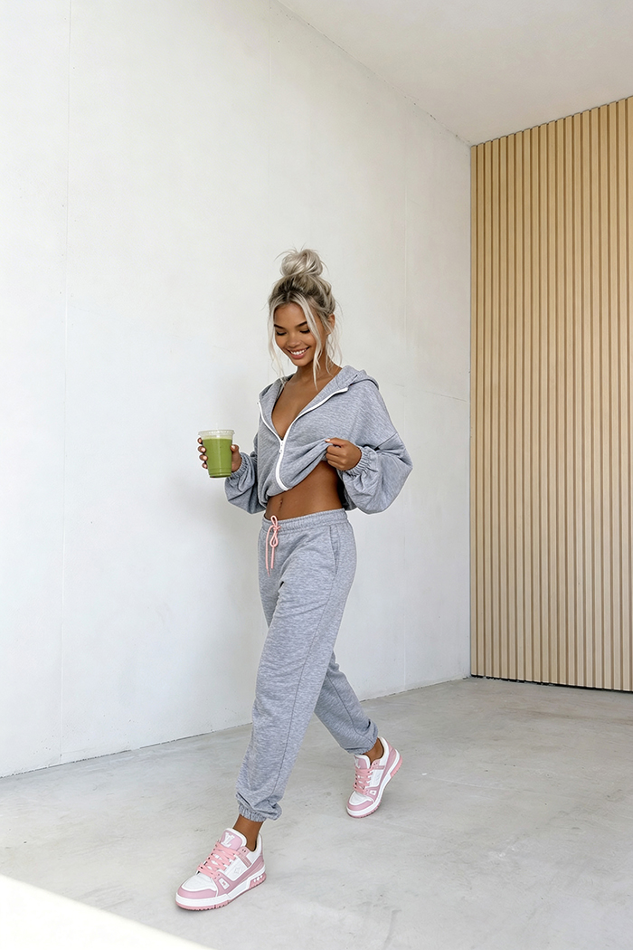 3-częściowy komplet, który łączy wygodę z nowoczesnym stylem. W jego skład wchodzi bluza z zamkiem i kapturem, spodnie z elastyczną talią oraz dopasowany top, tworząc spójną i funkcjonalną całość. Idealny wybór na co dzień – zapewnia komfort noszenia, swobodę ruchów i modny wygląd bez wysiłku.