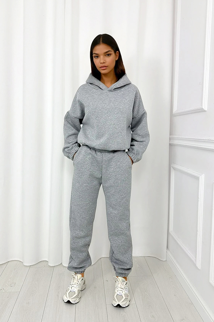 Komplet dresowy basic – spodnie z gumą w pasie i oversize’owa bluza z kapturem. Klasyka, która pasuje do wszystkiego!