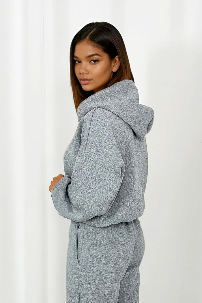 Uszyty z gęsto tkanego materiału, od spodu wykończonego miękkim, otulającym meszkiem, który przyjemnie grzeje i zapewnia komfort przez cały dzień. Dzianina jest sprężysta i elastyczna, dzięki czemu komplet dopasowuje się do sylwetki i zachowuje swój kształt nawet przy częstym noszeniu.