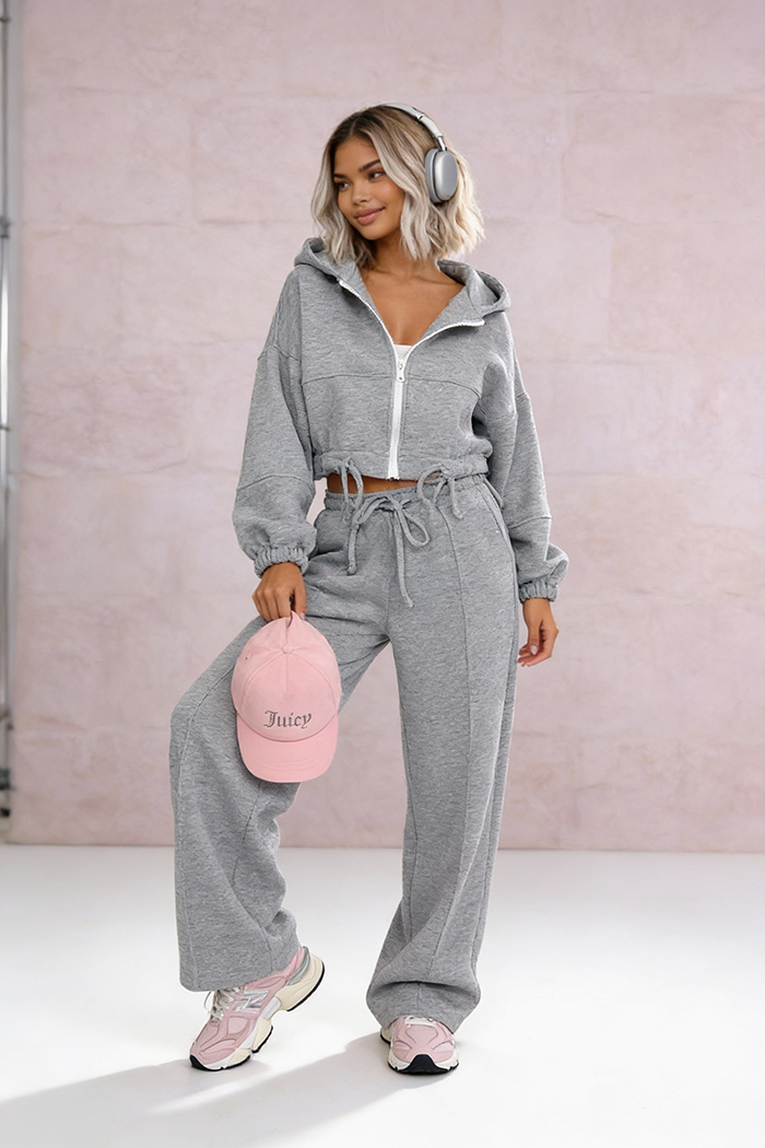 Komplet dresowy NY– proste spodnie oversize z troczkiem i przeszyciami i oversize’owa zapinana bluza z kapturem i troczkami. Efektowny basic, który pasuje do wszystkiego!