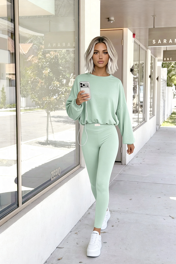 Ultrawygodny komplet wykonany z masełka - dzianina premium, która w składzie ma aż 50% wiskozy! Legginsy z wysokim stanem, zakończone nieuciskającą gumką oraz bluza z gumką na dole.
