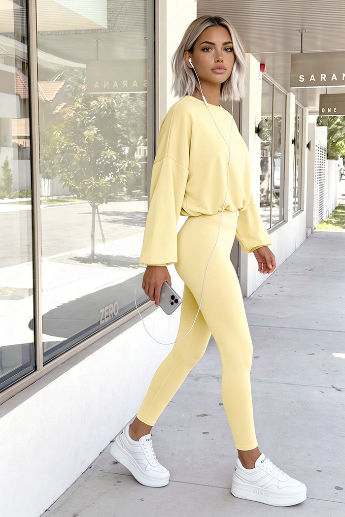 Ultrawygodny komplet wykonany z masełka - dzianina premium, która w składzie ma aż 50% wiskozy! Legginsy z wysokim stanem, zakończone nieuciskającą gumką oraz bluza z gumką na dole.