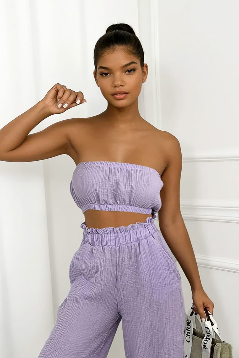 Muślinowy komplet – top bandeau + szerokie spodnie