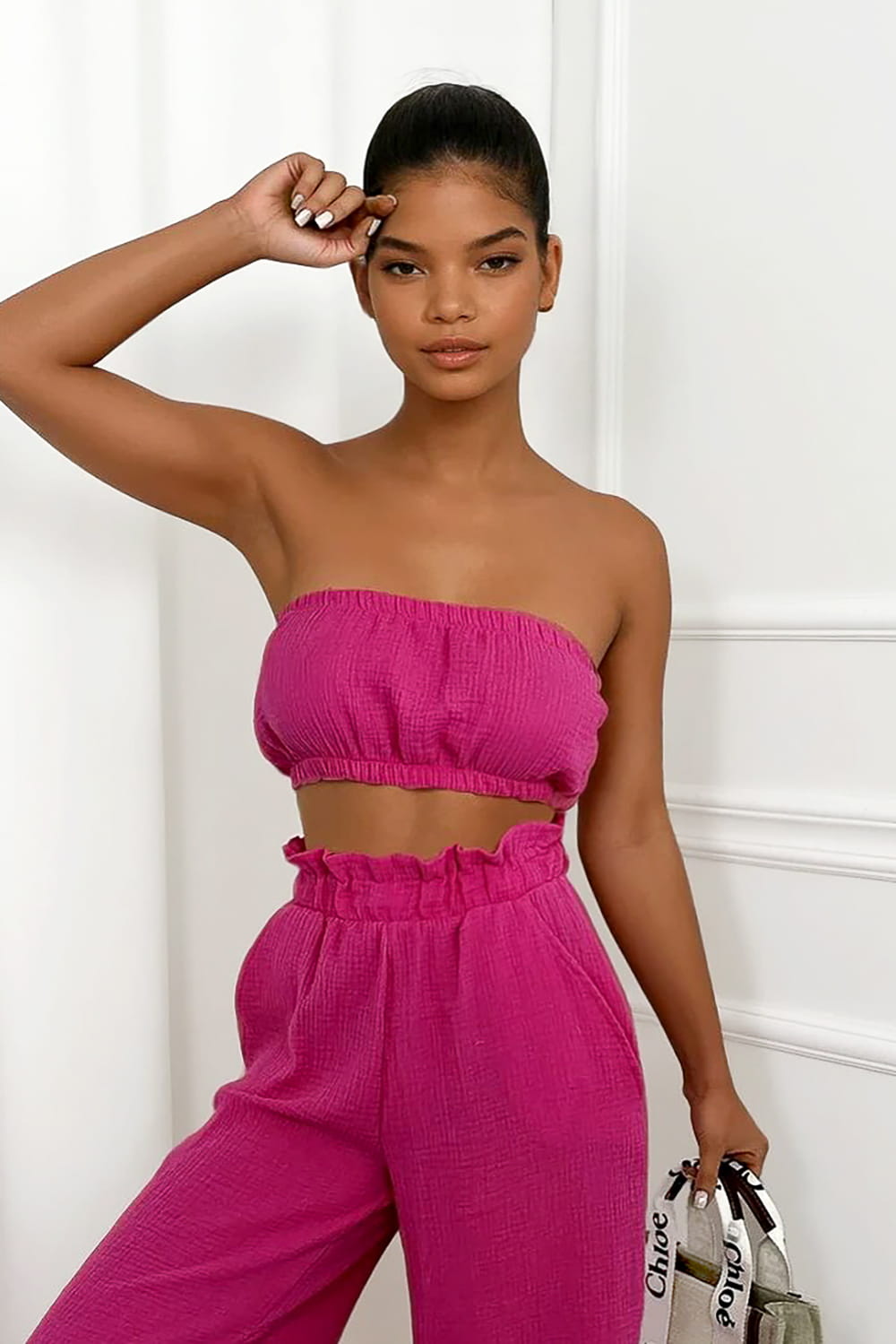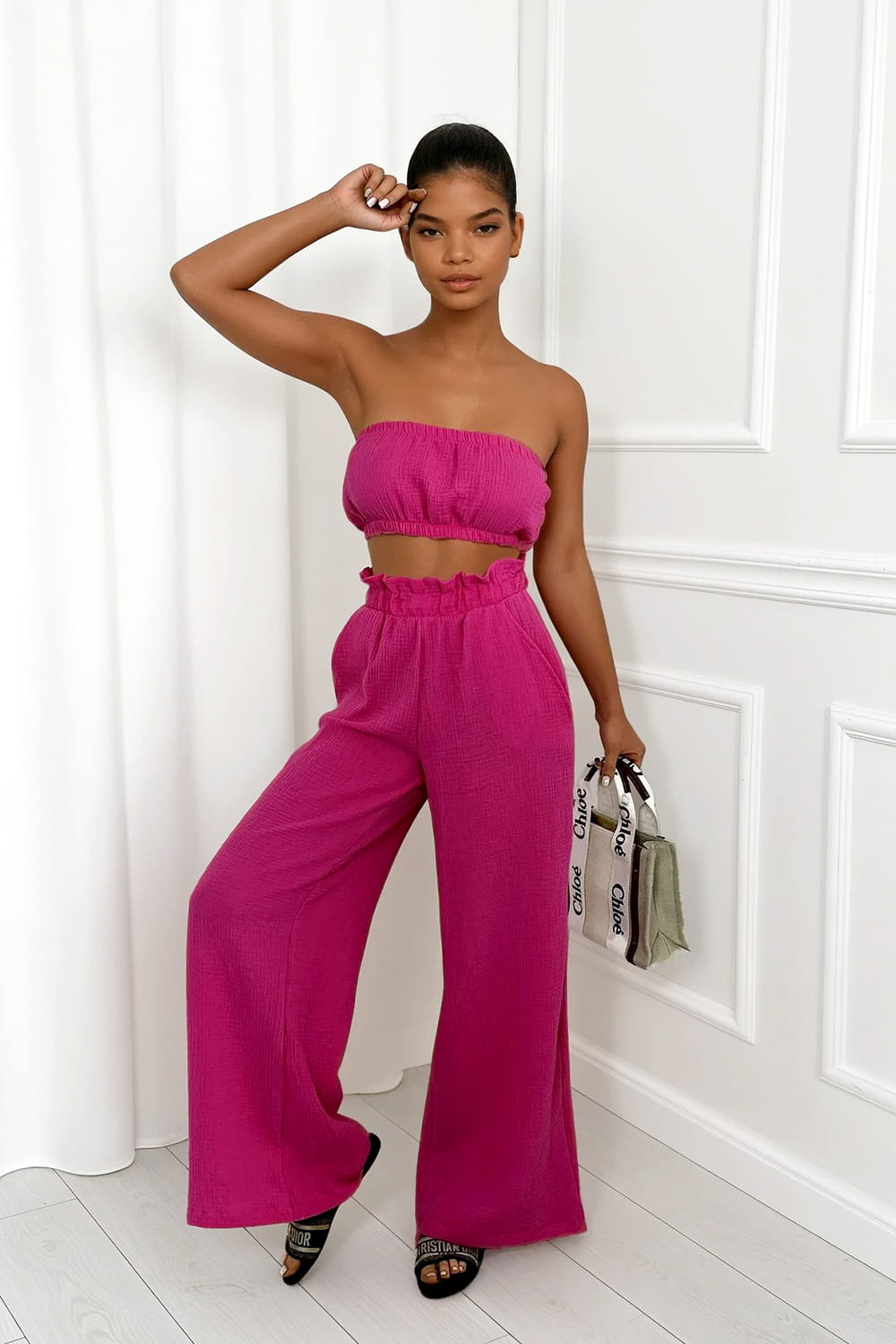 Muślinowy komplet – top bandeau + szerokie spodnie