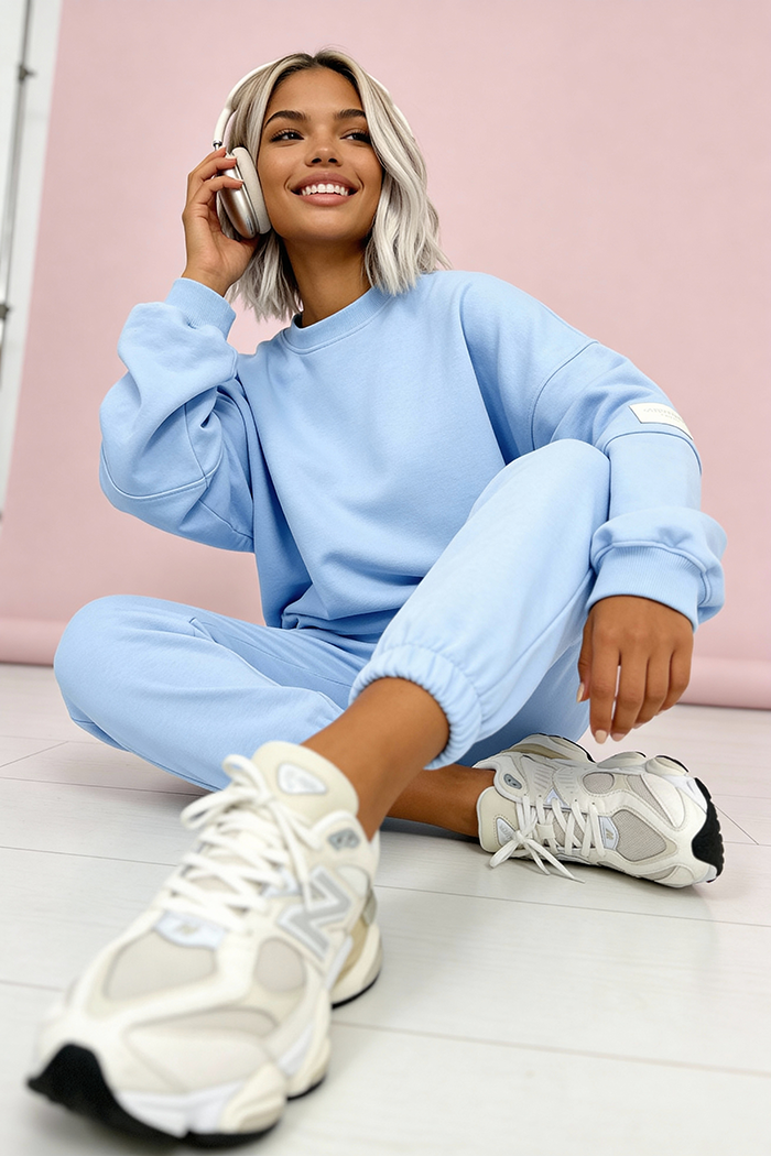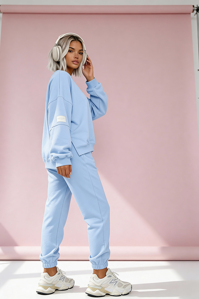 Świetnie się układa, spodnie nie opinają, a bluza ma fajny, luźny krój. Kolor pastelowy wygląda dokładnie jak na zdjęciu.
