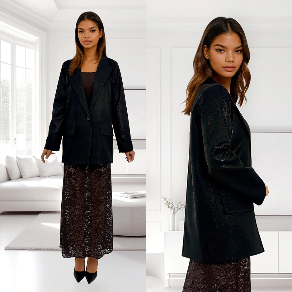 Marynarka She to stylowy, dopracowany model marynarki idealny na co dzień. Materiał jest gładki, trwały i świetnie układa się na sylwetce, dzięki czemu marynarka prezentuje się wyjątkowo estetycznie w każdej stylizacji. Wnętrze zostało wykończone podszewką, co zapewnia komfort noszenia i dodaje całości klasy.