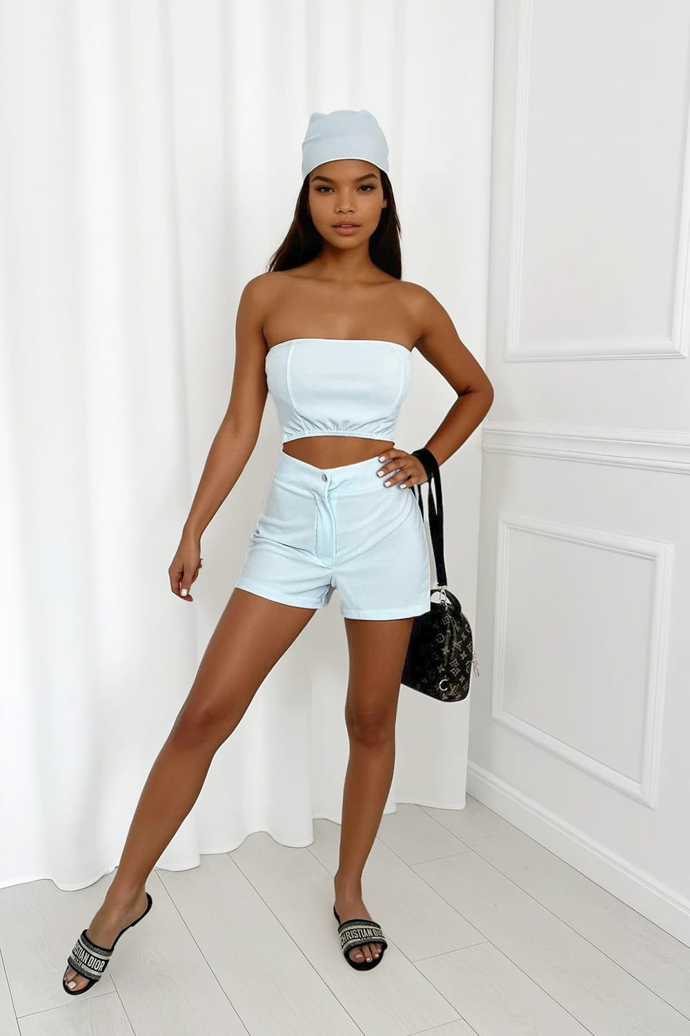 Stylowy komplet: spodenki, top i chustka – dostępny w jednolitych kolorach lub kwiatowych printach. Wykonany z przyjemnego, niegniotącego się materiału, który łączy wygodę z modnym wyglądem. Idealny na lato!