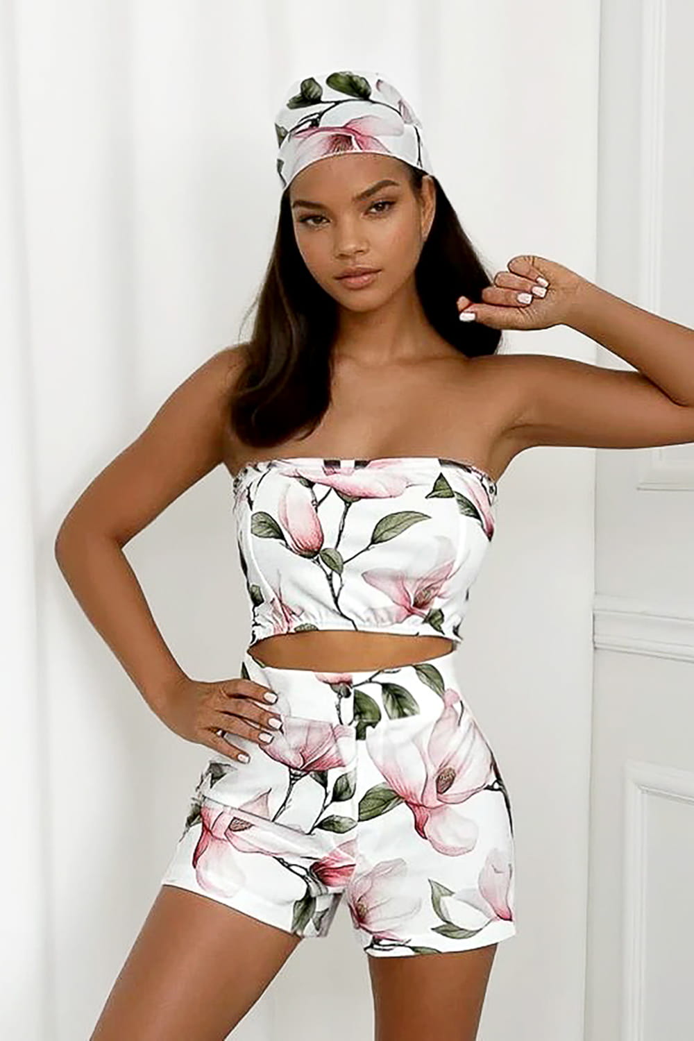 Stylowy komplet: spodenki, top i chustka – dostępny w jednolitych kolorach lub kwiatowych printach. Wykonany z przyjemnego, niegniotącego się materiału, który łączy wygodę z modnym wyglądem. Idealny na lato!