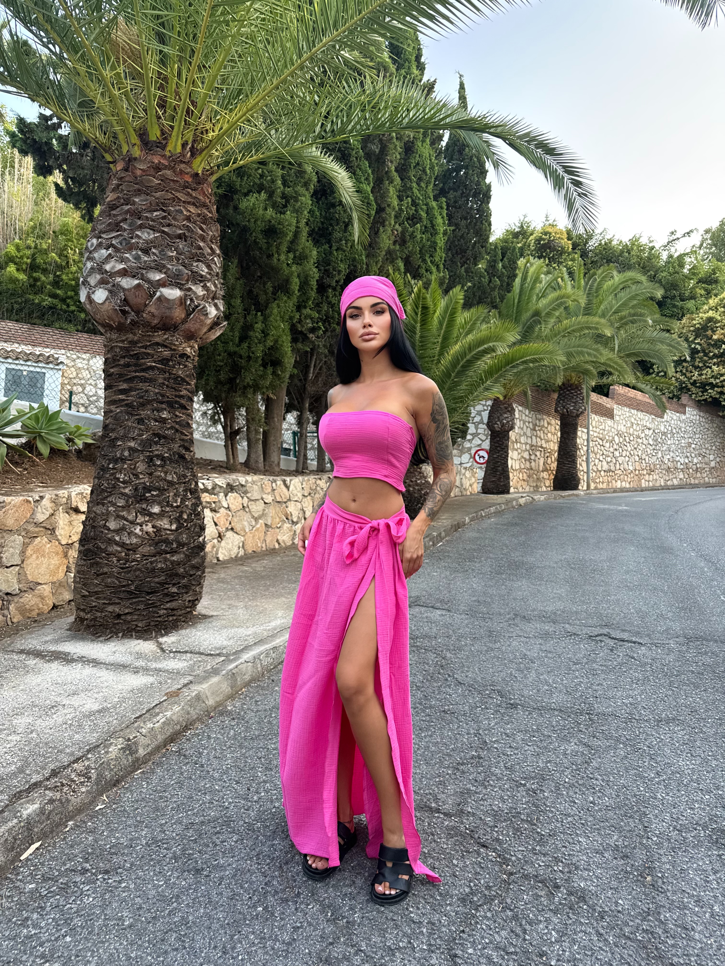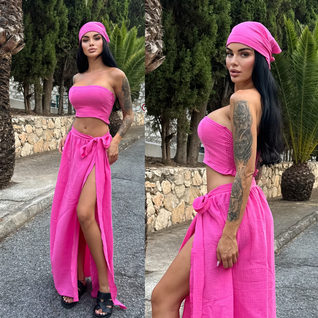 Lekki, przewiewny komplet z muślinu – idealny na lato! Składa się z dopasowanego topu, wiązanej spódniczki i stylowej chustki. Zwiewny, kobiecy i niezwykle wygodny. Postaw na styl i komfort w upalne dni!
