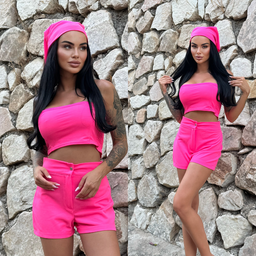 Stylowy komplet: spodenki, top i chustka – dostępny w jednolitych kolorach lub kwiatowych printach. Wykonany z przyjemnego, niegniotącego się materiału, który łączy wygodę z modnym wyglądem. Idealny na lato!