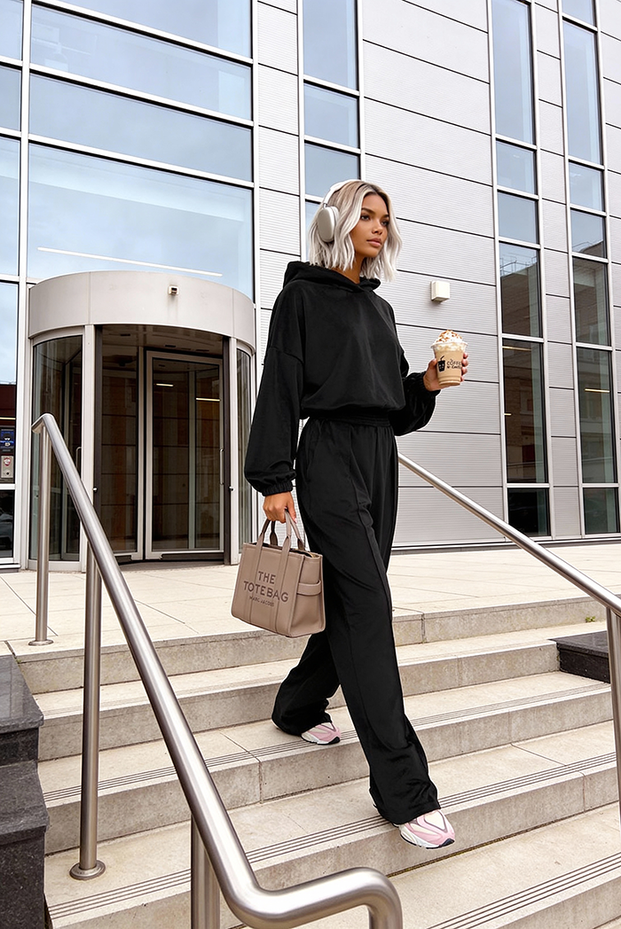 Komplet, który łączy wygodę i modny, swobodny styl. Krótka bluza z długimi, szerokimi spodniami tworzy harmonijną całość, a kaptur i praktyczna kieszeń dodają komfortu i casualowego charakteru.
