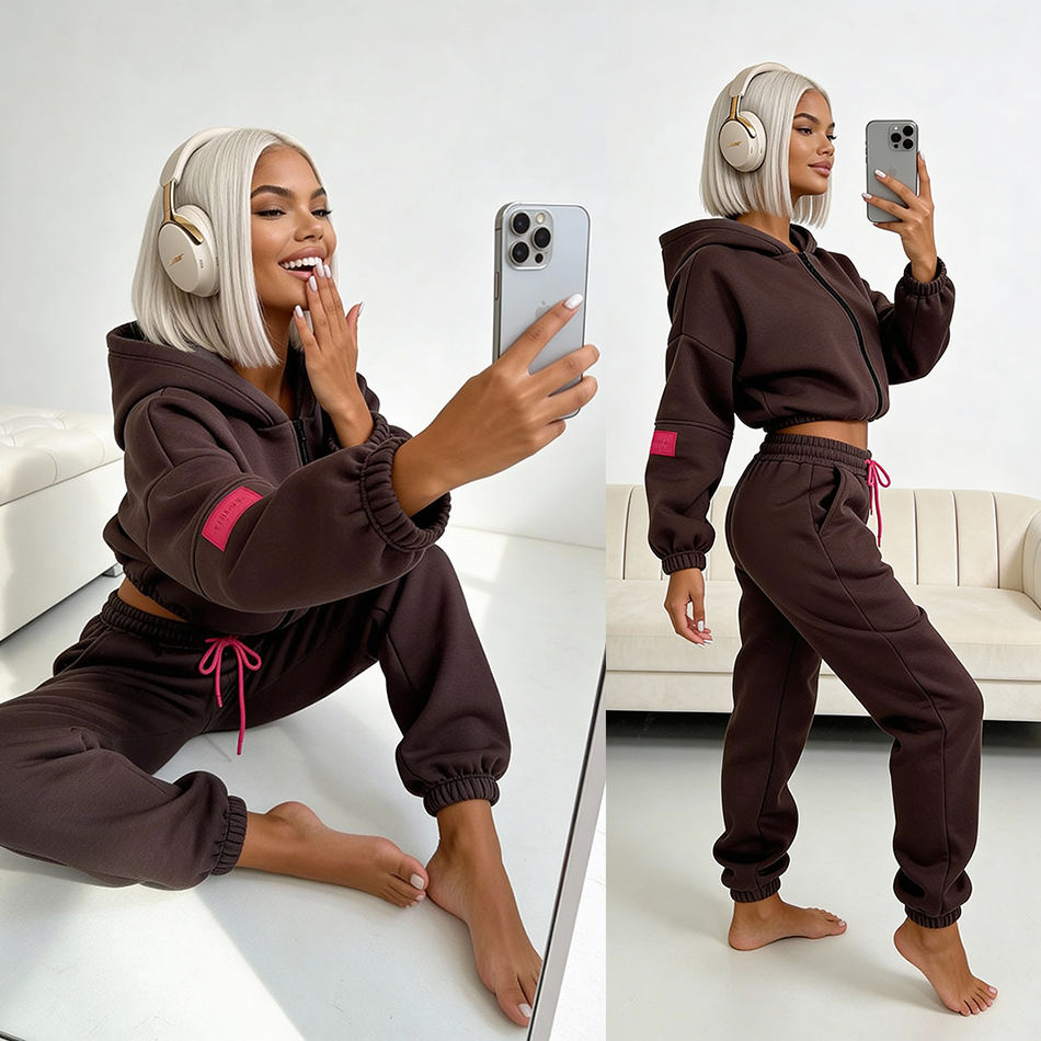 Ten komplet to doskonałe połączenie wygody i stylu. Ciepły, miękki od środka, przyjemny w noszeniu, a przy tym praktyczny i nowoczesny dzięki rozpinanej bluzie oraz subtelnym akcentom w intensywnym kolorze fuksji. Możesz nosić go jako całość lub łączyć poszczególne elementy z innymi ubraniami, tworząc wiele komfortowych, miejskich stylizacji.