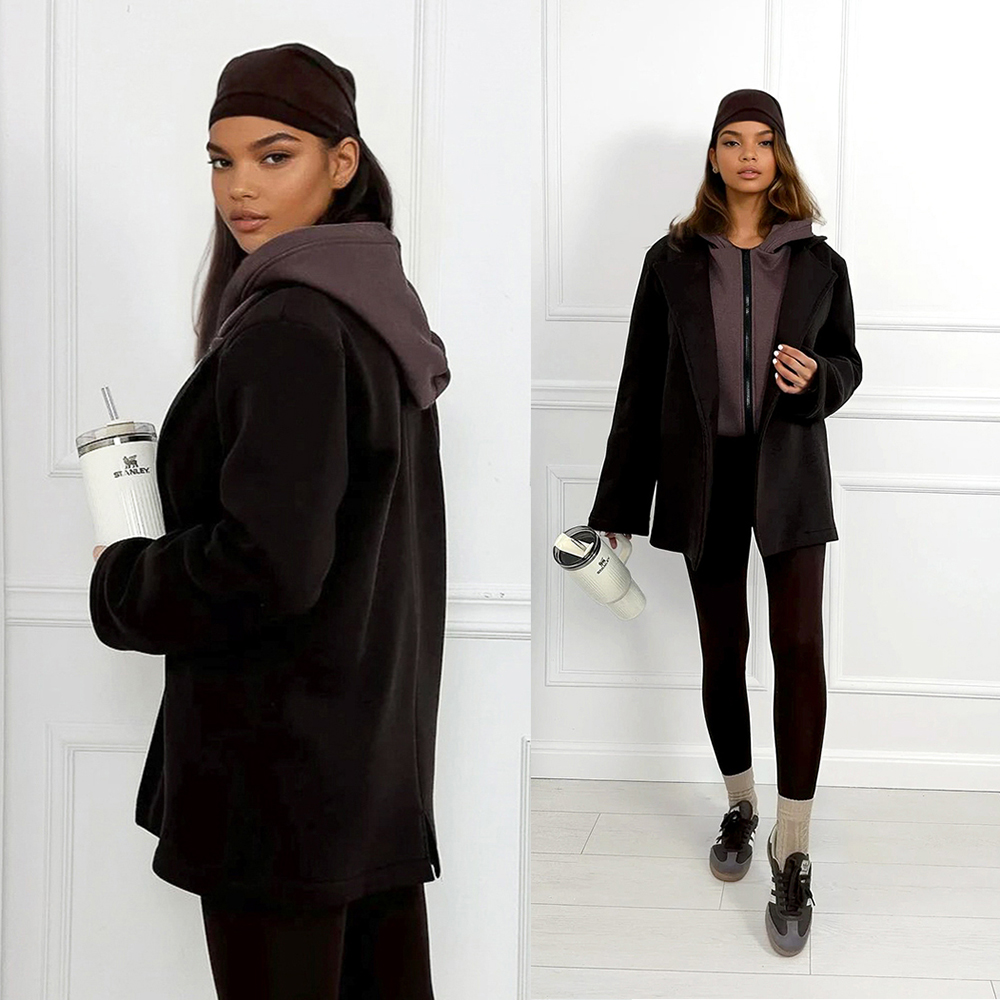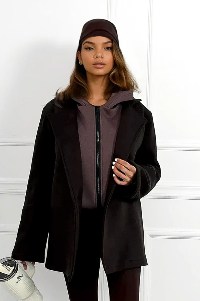 Wykonana z wysokiej jakości dzianiny dresowej, od wewnątrz wykończonej miękkim, drapanym włóknem. To właśnie ono tworzy efekt „misia”, który otula ciepłem i sprawia, że marynarka jest niezwykle przytulna. Struktura materiału jest elastyczna i sprężysta, dzięki czemu fason pięknie układa się na sylwetce, pozostając komfortowy w noszeniu. To idealne połączenie elegancji i funkcjonalności w codziennym wydaniu.