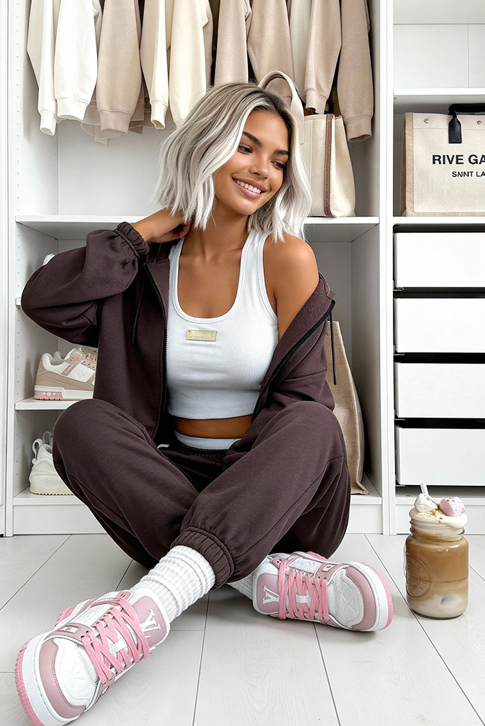 Komplet został uszyty z dzianiny dresowej premium – mięsistej, gęsto tkanej i bogatej w dotyku, która łączy mięsistość, gęstość i wyjątkową miękkość. Bogata w dotyku, aksamitna i sprężysta – materiał pięknie układa się na sylwetce, podkreślając jej naturalne kształty i zapewniając pełen komfort noszenia. Materiał jest wyjątkowo przyjemny dla skóry, sprężysty i elastyczny.