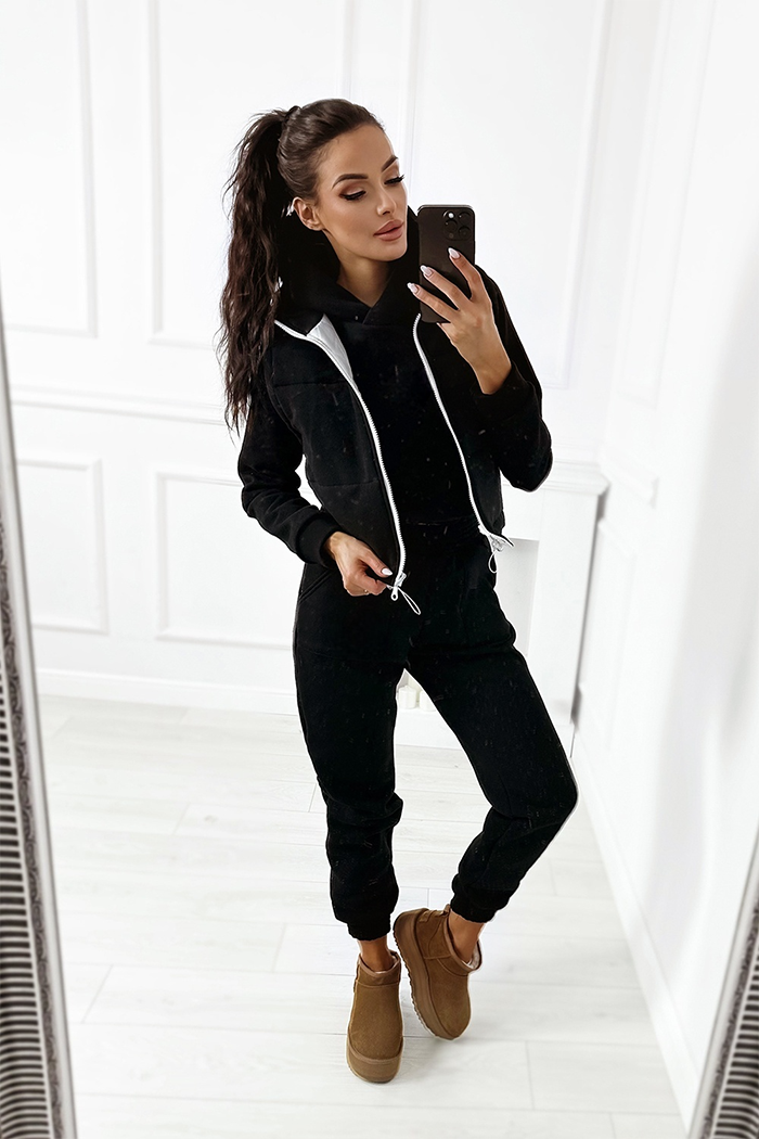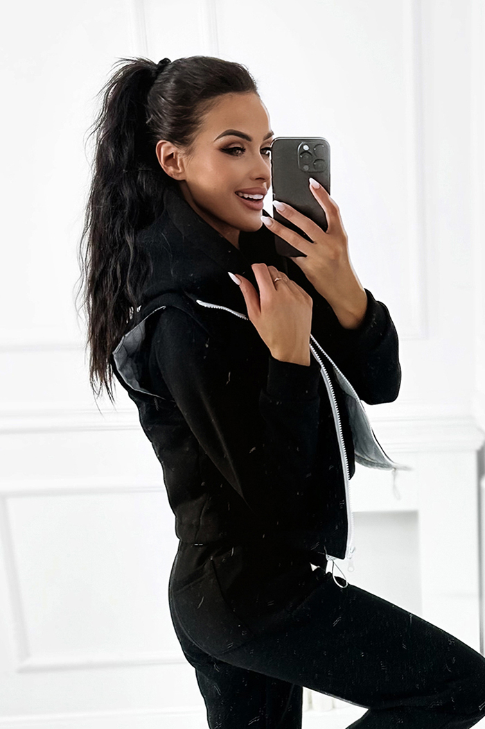 W skład zestawu wchodzą: długie spodnie z wysokim stanem, wygodna bluza z kapturem oraz oryginalny bezrękawnik. Bluza wykończona została elastyczną, nieuciskającą gumką u dołu, a spodnie świetnie podkreślają sylwetkę.