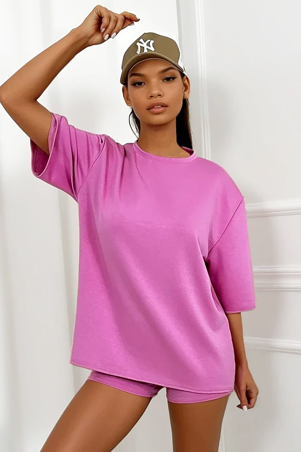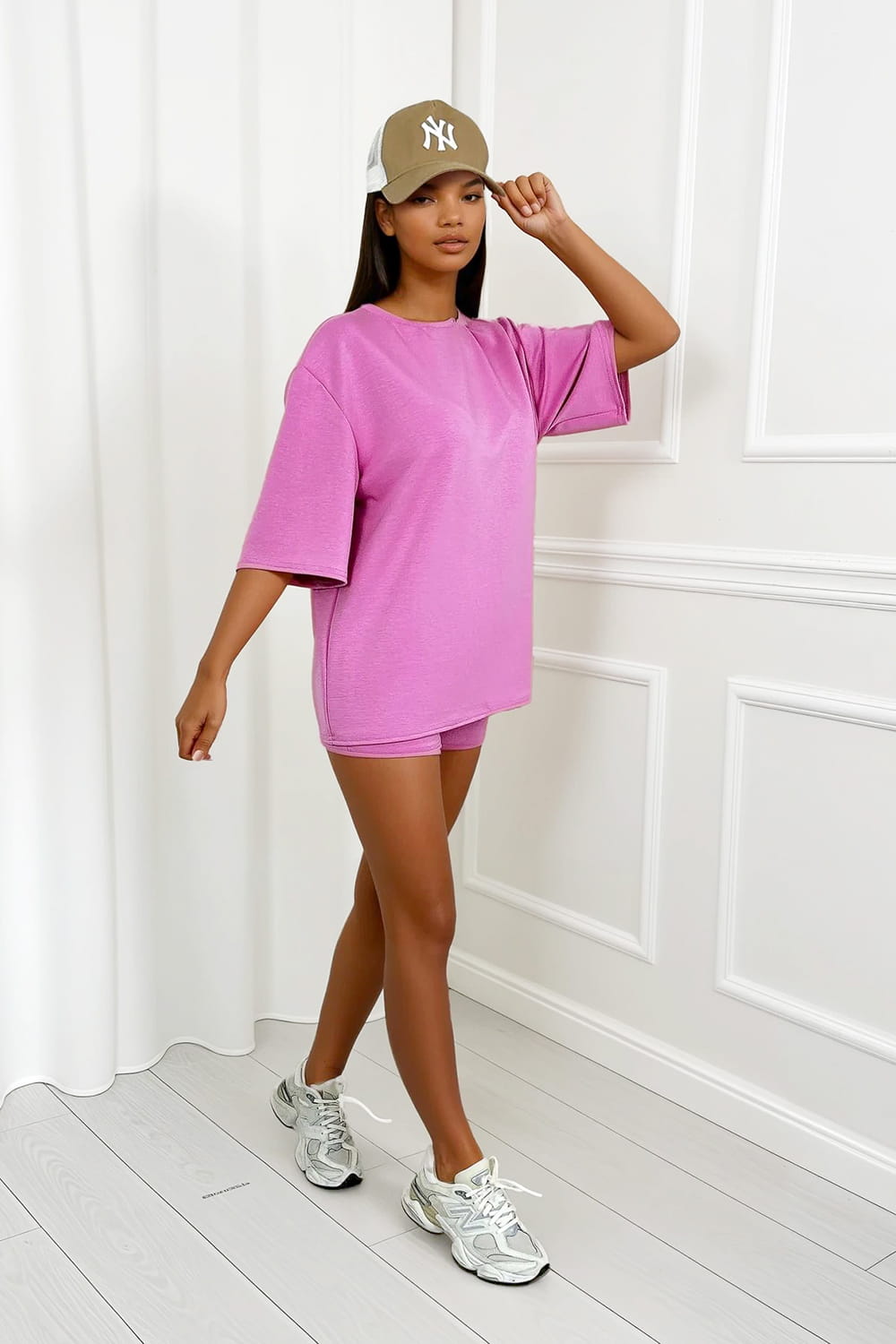 Stworzony z wyjątkowo miękkiego i delikatnego materiału. Składa się z dopasowanych krótkich spodenek oraz oversize’owej bluzki. Lekko sportowy, ale wciąż stylowy look – idealny na spacer, wyjazd czy codzienne wyjście w upalne dni.