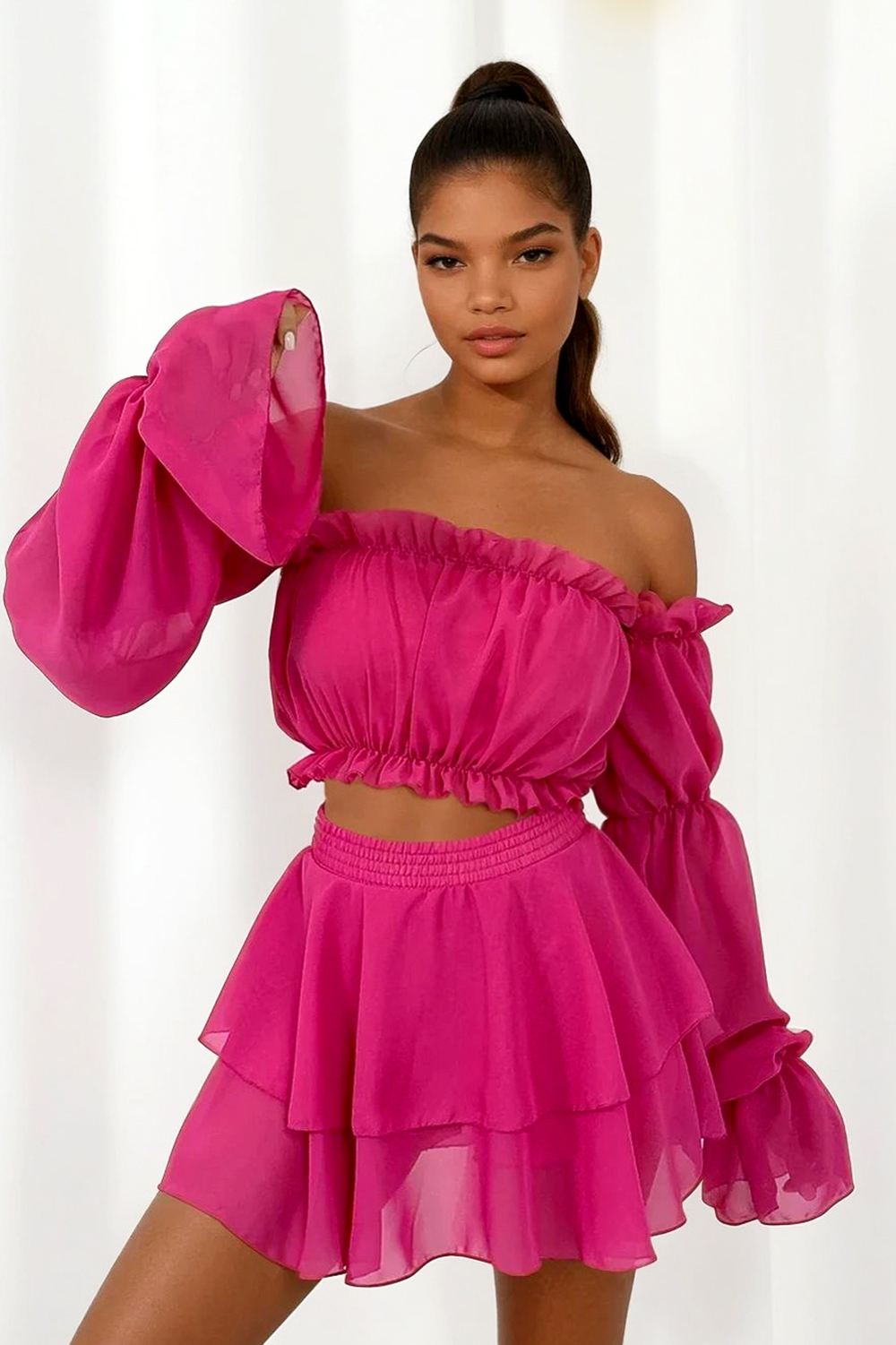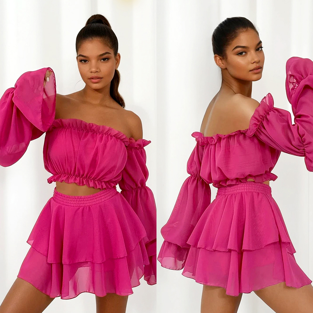 Dwuczęściowy zestaw wykonany z przewiewnego szyfonu. W skład kompletu wchodzi luźny top oraz spódnico–spodenki. Do topu dołączony jest dopasowany top pod spód w tym samym kolorze, dzięki czemu materiał nie prześwituje. Idealny wybór na letnie dni.