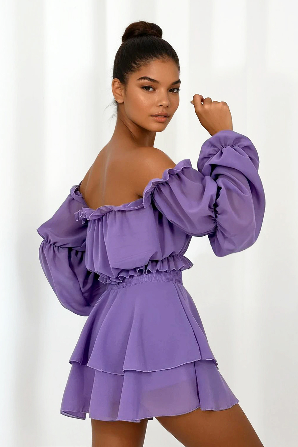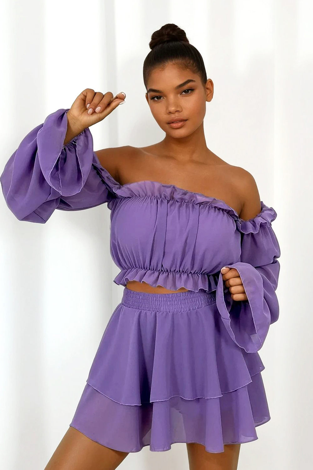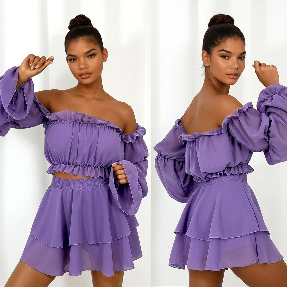 Dwuczęściowy zestaw wykonany z przewiewnego szyfonu. W skład kompletu wchodzi luźny top oraz spódnico–spodenki. Do topu dołączony jest dopasowany top pod spód w tym samym kolorze, dzięki czemu materiał nie prześwituje. Idealny wybór na letnie dni.