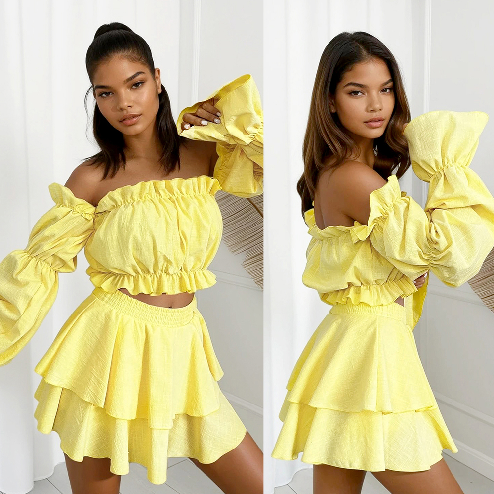 Dwuczęściowy komplet wykonany w 100% z bawełny. W zestawie hit sezonu czyli bluzka hiszpanka oraz spódnico–spodenki. Naturalny, przewiewny materiał sprawia, że to idealna opcja na ciepłe dni!