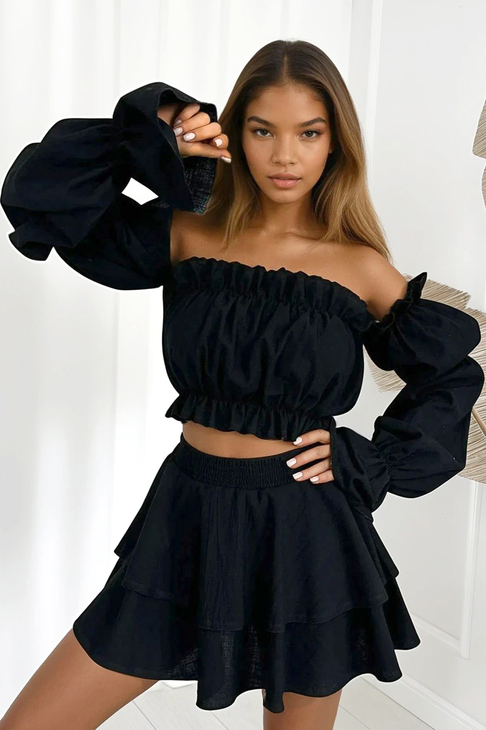 Dwuczęściowy komplet wykonany w 100% z bawełny. W zestawie hit sezonu czyli bluzka hiszpanka oraz spódnico–spodenki. Naturalny, przewiewny materiał sprawia, że to idealna opcja na ciepłe dni!