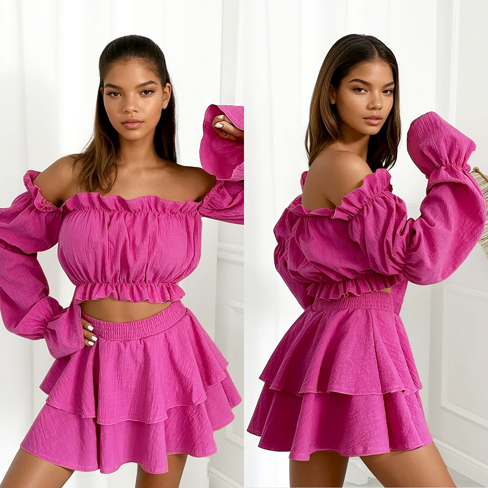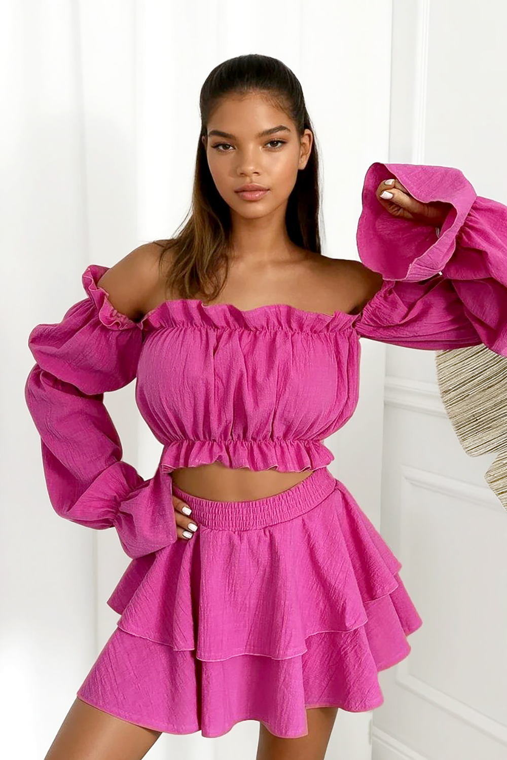 Dwuczęściowy komplet wykonany w 100% z bawełny. W zestawie hit sezonu czyli bluzka hiszpanka oraz spódnico–spodenki. Naturalny, przewiewny materiał sprawia, że to idealna opcja na ciepłe dni!