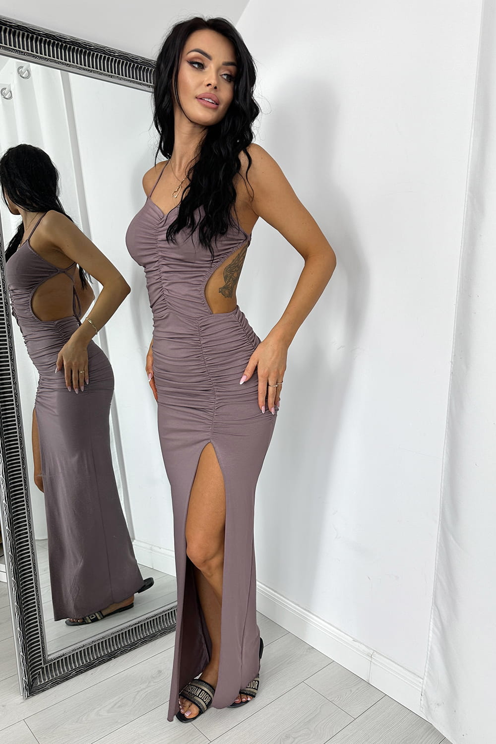 Sukienka maxi z wiskozy z efektownym wiązanym tyłem i marszczeniami po bokach. Wykonana z miękkiej, dopasowującej się tkaniny, pięknie podkreśla sylwetkę. Kobieca, zmysłowa i idealna na letnie wyjścia.